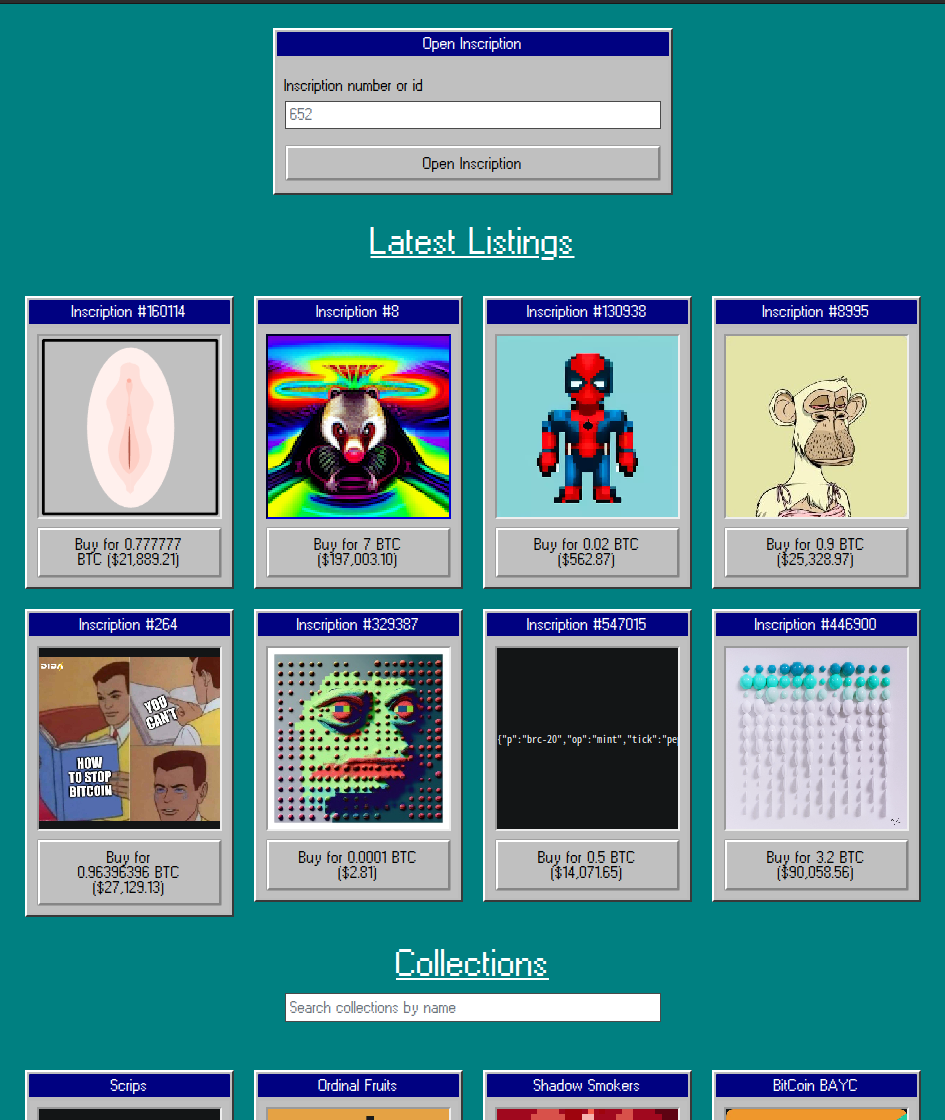 Inscriptionは、Inscription numberを入力することで指定できる。Collectionページにリストされてるコレクションは、↓のリポジトリから取得してるみたい。