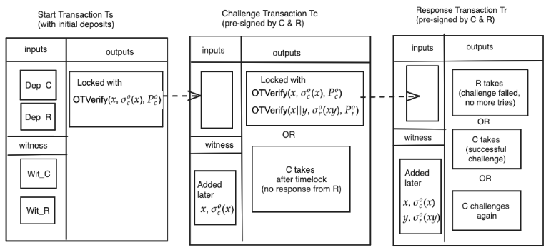 実際に書き込まれる命令は、(後述する)実行結果の間違いの検証時にオンチェーンで実際に実行するとあるので、Bitcoinで使用可能なopcodeだと思われる。ただ、Bitcoinのopcodeは算術演算は32-bitに限定されていたりと、現状のopcodeのみで十分なのかは怪しい。